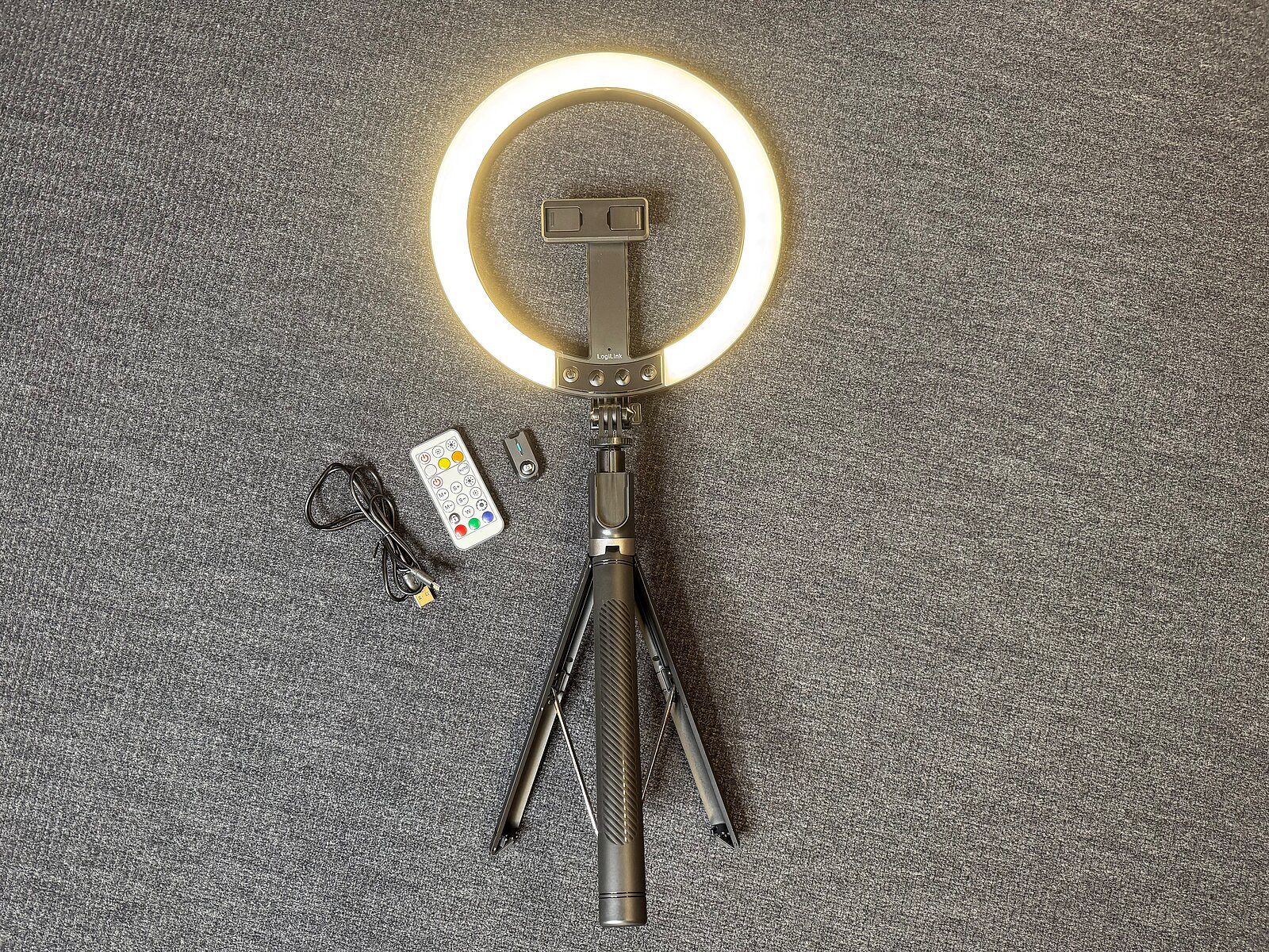 Stativ mit integrierter Halterung für Bluetooth-Fernbedienung und Smartphone Halterung.