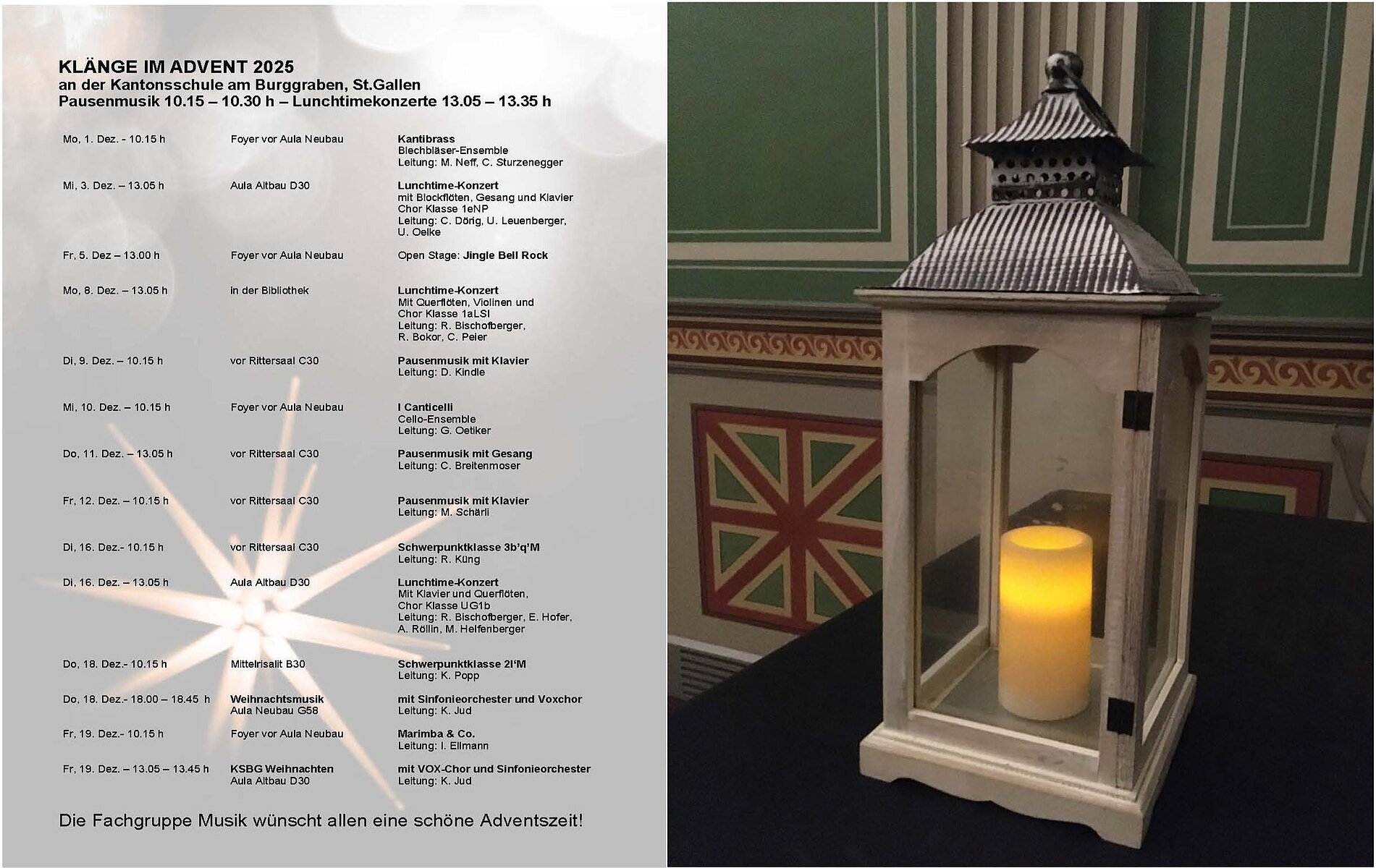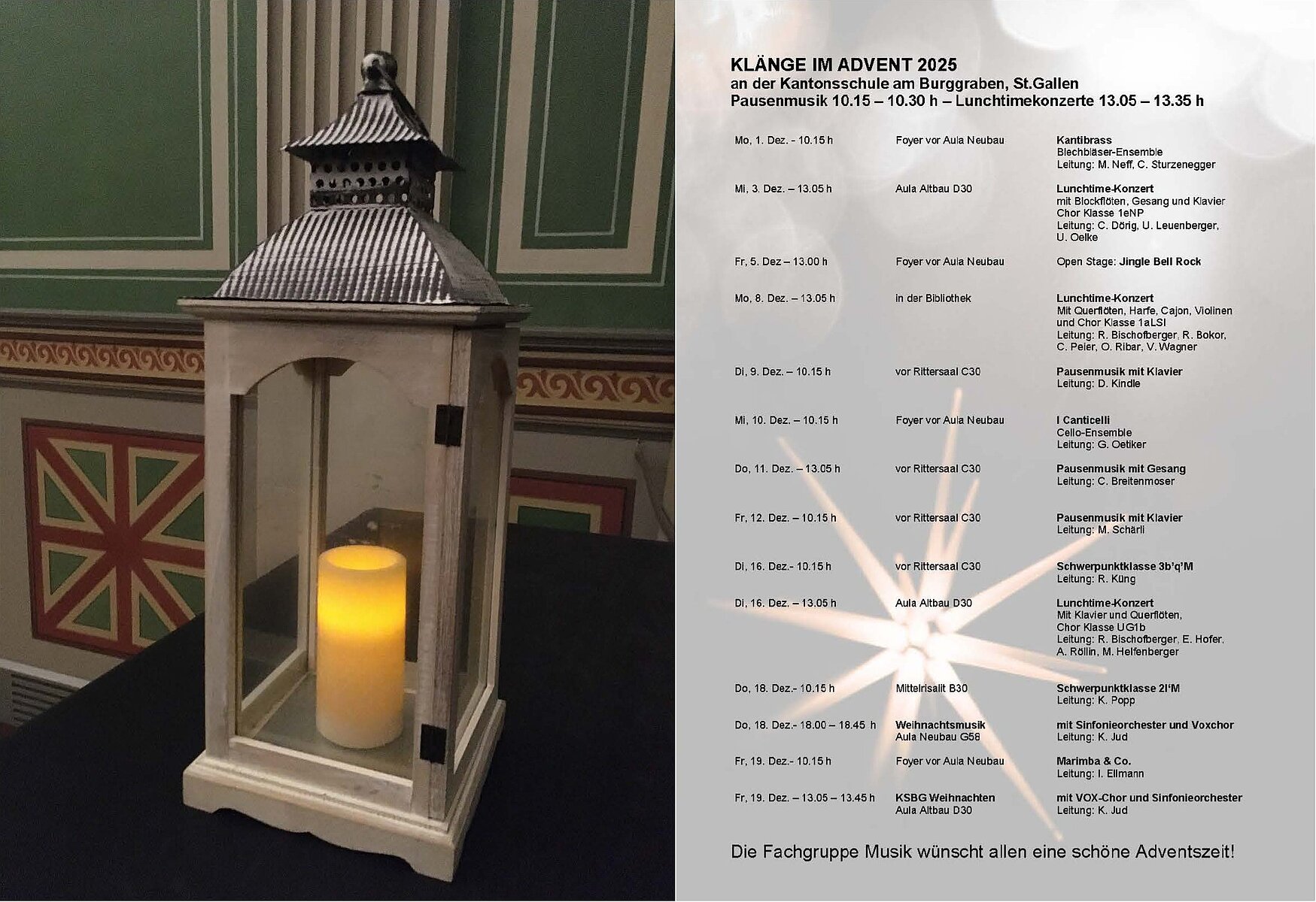 Ab Montag, dem 01. Dezember 2025 finden im Schulhaus kleine musikalische Happenings statt, um auf Weihnachten einzustimmen. Wer, was, wann, wo spielt, ist in der Übersicht zu finden.