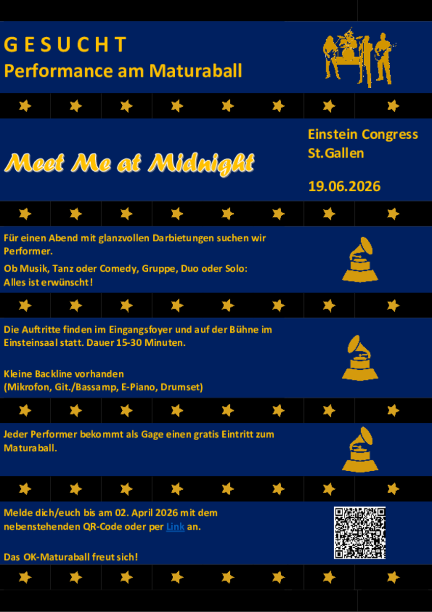 Wir freuen uns jetzt schon auf den Maturaball am 19. Juni im Einstein Congress. Für einen Abend voller verzauberter Darbietungen werden Performer aus den Sparten Musik, Tanz oder Comedy gesucht. Weitere Informationen gibt es im Flyer. Die Anmeldung erfolgt bis Donnerstag, 2. April, über Forms.