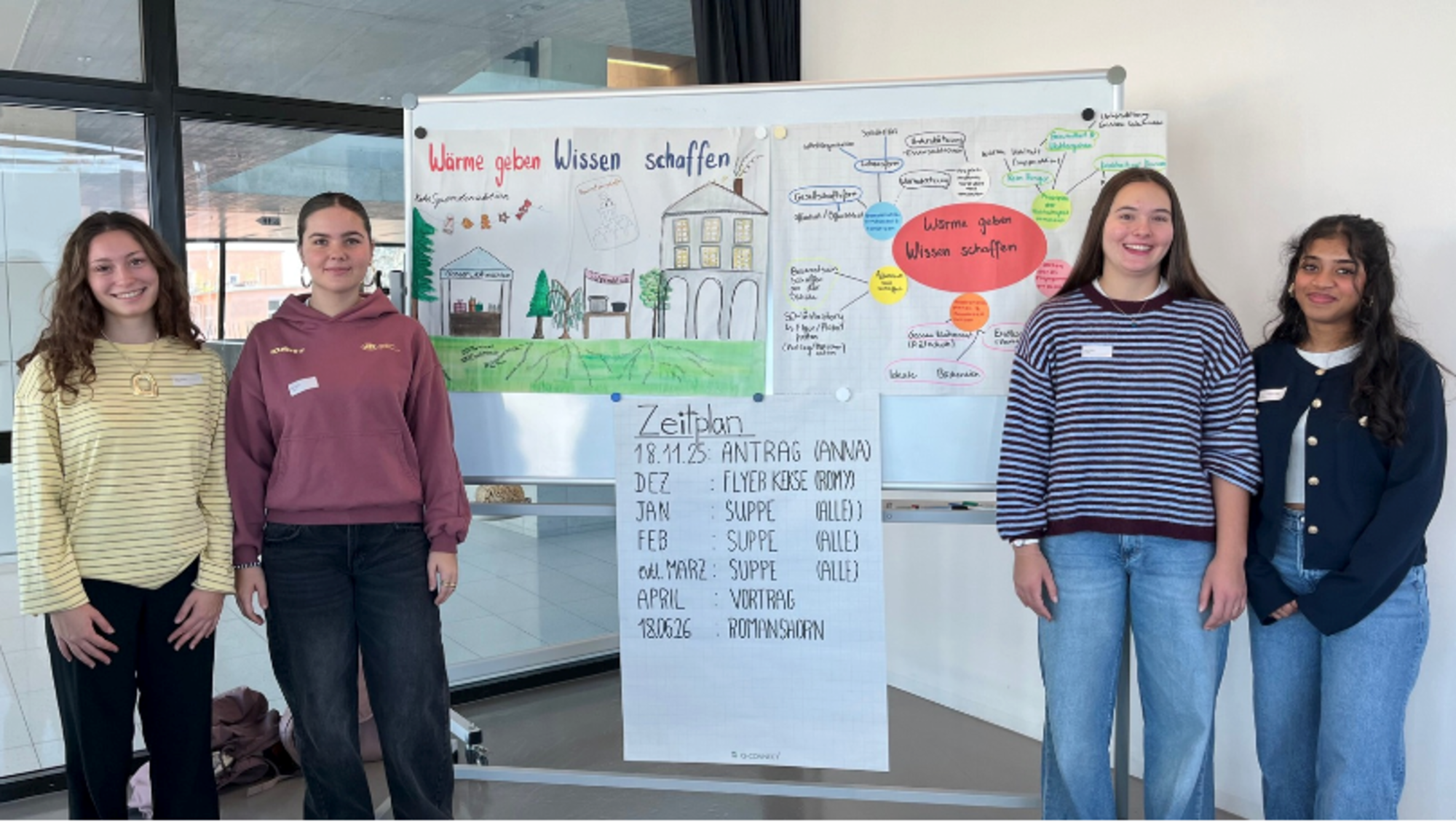 Vom 13. bis 15. November fanden die Civic Education Days im Rahmen der Internationalen Bodenseekonferenz in Kreuzlingen zum Thema "Demokratie" und "Nachhaltigkeit" mit neun Schulen aus drei Ländern statt. Jane Dreier, Romy Schmid, Rena Hendrick Rogin und Anna Müller, 3fNP, entwickelten dabei ein Projekt mit dem Titel "Wärme geben, Wissen schaffen“, das sie im Laufe dieses Schuljahres umsetzen möchten. Ihren Fortschritt dürfen sie im Juni 2026 an der Jugendkonferenz in Romanshorn vor Politikerinnen und Politikern aus den drei Regionen präsentieren.