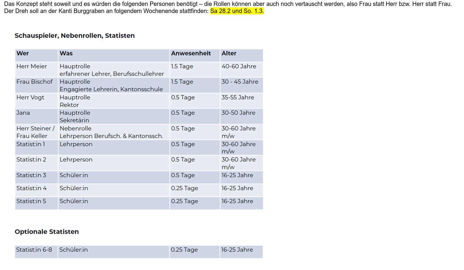 Die Fachstelle Datenschutz wird ein professionelles Video zur Sensibilisierung der Sekundarstufe II erstellen. Dazu werden noch Darstellerinnen und Darsteller gesucht (vgl. Übersicht). Die Dreharbeiten werden am Wochenende vom 28. Februar, 1. März 2026 stattfinden. Die Mitarbeit wird entschädigt (Hauptrollen bis Fr. 250.- bis 300.-, Statisten Fr. 50.-). Wer sich dafür interessiert, kann sich bei der Rektoratssekretärin Sonja Greutmann (C18) bis Donnerstag, 12. Februar, melden.