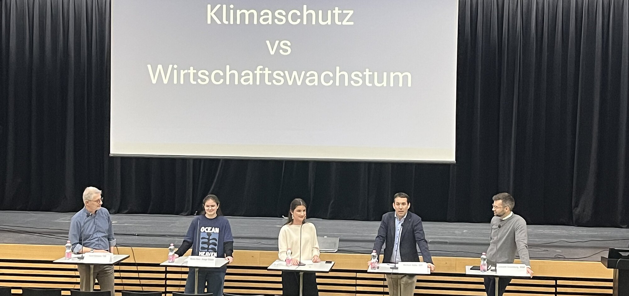 Sich mit politischen Themen zu berschäftigen, verschiedene Meinungen zu hören und sich kritisch damit auseinanderzusetzen, ist ein wichtiger Teil der gymnasialen Ausbildung. An der Podiumsdiskussion vorgestern Dienstag, organisiert von Schülerinnen und Schülern des Ergänzungsfachs Politik, diskutierten Leonard Creutzburg (WWF), Karel Ehmann (Thurgauer Kantonalbank), Michael Götte (SVP) und Maira Narr (Junge Grüne) zum Thema "Klimaschutz vs Wirtschaftswachstum". Sechs Klassen konnten nicht nur der angeregten Podiumsdiskussion folgen, sondern auch sich beim anschliessenden Apéro mit den vier Gästen austauschen und ihnen Fragen stellen.